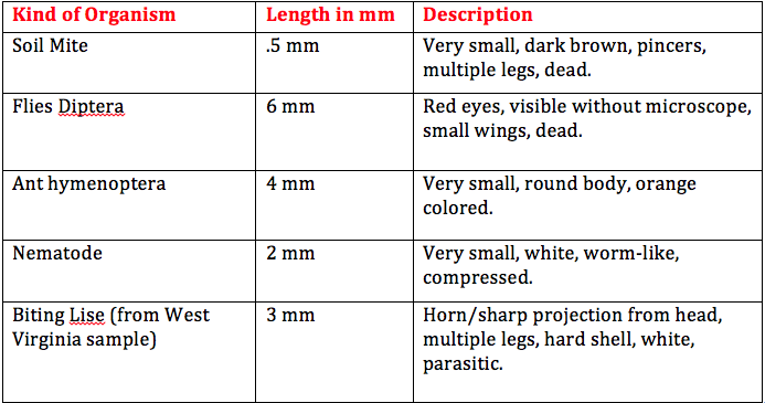 The size range of organisms in our transect was between .5 and 6 mm. The largest organism was the flies diptera and it was visible without using the dissecting microscope. The soil mite was the smallest organism found and they are one of the most common in leaf litter. Other common organisms found in leaf litter include nematodes, ground spiders, millipedes, centipedes, springtails, and more. There are various vertebrates that might inhabit our transect. One species could possibly be the American Robin. It is part of the kingdom Animalia, phylum Chordata, class Aves, order Passeriformes, family Turdidae, genus Turdus, and species T. migratorius. Biotic factors that would benefit the American Robin include trees, berries on the holly bushes, and branches and twigs found on the ground. This species would benefit from abiotic factors such as soil for when they are building their nests. Another vertebrate species that possibly inhabits our transect is the Field Sparrow. It belongs to the kingdom Animalia, phylum Chordata, class Aves, order Passeriformes, family Emberizidae, genus Spizella, and species S. pusilla. Biotic factors that could benefit this species include trees, berries, pine needles, and branches and twigs. Abiotic factors that could be beneficial to them include soil, sunlight, and rain water. Another vertebrate species that could be found in our transect could be the Eastern Gray Squirrel. It belongs to the kingdom Animalia, phylum Chordata, class Mammalia, order Rodentia, family Sciuridae, genus Sciurus, subgenus Scuirus, and species S. carolinensis. Biotic factors that the Eastern Gray Squirrel could benefit from include trees, berries, and leaves. Abiotic factors that could benefit this species include soil and sunlight. Another vertebrate species possibly found in our transect could be the Brown Rat. It belongs to the kingdom Animalia, phylum Chordata, subphylum Vertebrata, class Mammalia, order Rodentia, family Muridae, subfamily Muridae, genus Rattus, species R. norvegicus. This species could benefit from biotic factors such as plant matter on the ground and other organisms found in the soil. Abiotic factors they could benefit from in our transect would be soil and any garbage left by humans. One last vertebrate that could be found in our transect could be the Deer Mouse. It belongs to kingdom Animalia, phylum Chordata, class Mammalia, order Rodentia, family Cricetidae, genus Peromyscus, and species P. maniculatus. Biotic factors that this organism could benefit from include other organisms living in the soil, plant matter on the ground, and berries. Abiotic factors that the Deer Mouse could benefit from include soil and rain water.