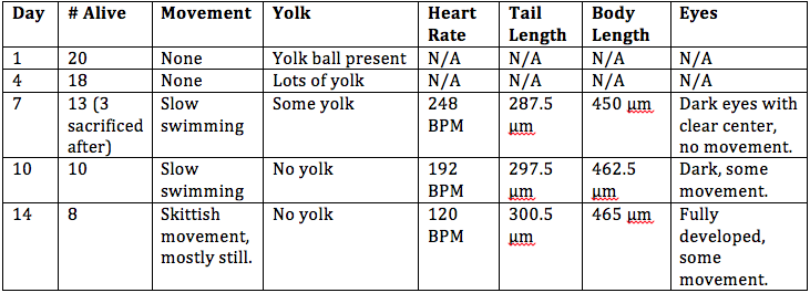 Procedures: 1. Examine prepared slides of starfish and frog embryos under a microscope. Observe the size, amount and distribution of yolk, blastulation, gastrulation, and larval stage. 2. Examine living 72 hour chick embryos under a dissecting scope. Observe the size, amount and distribution of yolk, blastulation, gastrulation, and larval stage. 3. Choose an experimental condition to test for the zebrafish experiment. 4. Observe zebrafish embryos and determine their developmental stage. 5. Set up a control group petri dish and a variable group control dish. Add 20 mls of deerpark water and 20 healthy embryos to each dish. 6. When embryos are 4-5 days old, remove 10 mls of water and add 25 mls of fresh water. 7. Observe a representative embryo from each dish on a depression slide and observe under a microscope. Observe degree of body and tail pigmentation, eyes and eye movement, heartrate, pectoral fin development, yolk sac size, development of swim bladder, development of mouth, and general movement. 8. At 7 days old, remove 5 mls of water with any dead embryos and add 5 mls of fresh water. Preserve 1 to 3 embryos from each dish in the paraformaldehyde. 9. Repeat step 7. 10. Between week 1 and week 2, remove 5 mls of water and add 10 mls. 11. Repeat step 7. 12. Feed 2 drops of paramecium after 1 week. 13. Make final observations and measurements after 2 weeks (step 7, as well as measure the length of the entire larvae and measure the diameter of the eyes).