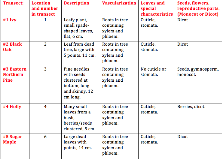 Results: Observations of plants from our transect: