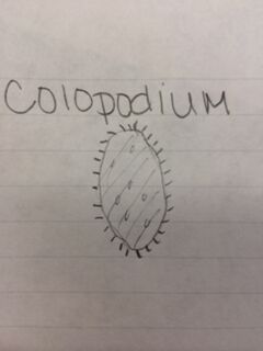 Results: Hay infusion observations - Dark brown water, residue on bottom of jar (sand or dirt), film-like mold or algae on surface of water, smells like dirt, plants and branches mixed in (unsettled). We took one sample from the residue on the bottom of the jar and one sample from a leaf in the middle of the jar. Organisms might differ near versus away from the plant matter depending on the way they eat. Organisms that are heterotrophs intake their food from other organic or inorganic compounds and their niche might be close to a plant where there is more food available. Organisms living in a niche near a plant depend on other organisms for survival. Organisms found on the bottom of the jar include a colopodium, euplotes, and actinosphaerium. The colopodium was 50 micrometers long, colorless, small and oval shaped, and moved around rapidly using cilia. The euplotes was 100 micrometers long, oval shaped, and moved rapidly with lots of long pointy cilia called cirri. The actinosphaerium 70 micrometers long, round shaped with long pointy "spines", colorless, and no movement. Organisms found from a leaf in the middle of the jar include a euplotes and paramecium multimicronucleaum. The euplotes was 100 micrometers long, small and oval shaped, colorless and rapid movement using long pointy cirri. The paramecium multimicronucleaum was 210 mirometers long, long and oval shaped, colorless, and had rapid movement using lots of tiny cilia. Since all of these organisms are colorless, they do not undergo photosynthesis and they are all protozoa. For an example of how one of these organisms meets all the needs of life, the paramecium is a great example. Paramecium obtain energy by using their cilia to sweep in other organisms through and oral groove and into their mouth. Paramecium are unicellular and perform all life functions through the one cell. The paramecium cell contains a genome, which is able to interpret hereditary and genetic information. They replicate asexually and are considered products of evolution because they have evolved from a single common ancestor into a unique species.