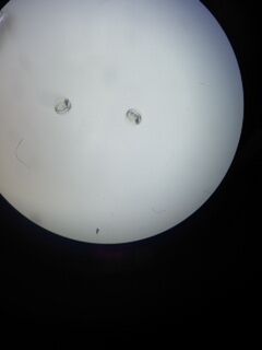 Data and Observations Before looking at the bacteria, my lab partners and I took more one look at the hay infusion culture before disposing of it. It had a stronger more moldy smell, more growth on top, and some water appeared to have evaporated. It also looked like something may have been growing on the sides of the jar. ext we examined the agar plates and recorded the growth of bacteria colonies on each plate. WE found that the 10^-3 agar nutrient plate had the most growth. It was not even possible to count all of the colonies. THe number than decreased as the dilutions did, with zero colonies found on the 10^-9 nutrient agar plate. The nutrient plus tetracycline plate of 10^-3 was the only plate of the tetracycline plates to grow any colonies at all, with an estimate of about 480 colonies. Overall there was much more bacteria on the plates without tetracycline. The Antibiotic plates also appeared to have bacteria more yellow in color. The nutrient only plates had both white and yellow bacteria. Fungus appeared to have grown on both of the 10^-3 plates, but more so on the nutrient only plates. Tetracycline works by binding to the 30S ribosome of bacteria. This prevents attachment of the tRNA to the RNA-ribosome complex (Mehta, A). Bacterial pathogens such as Chlamydia and Mycoplasma are some types of bacteria that are sensitive to Tetracycline (Chopra, I). When viewing the slides we had made, the first bacteria we looked at was from a nutrient only 10^-7 plate. The colonies appeared circular, and the actual individual cells looked like spirals, possibly streptococci, and they were not motile. They were also gram negative. The next bacteria slide observed was also taken from 10^-7 nutrient only plate. THe colony appeared as a cluster of very small bacteria, circular, and greenish black in color. The individual cells were not motile, circular, and this was also gram negative. The bacteria taken from the tetracycline plate was taken from the 10^-3 dilution plate. The colonies appears as spirals all connected together, possibly filamentous, and were greenish black in color. They were not motile cells and were also gram negative. The last slide (taken from the same tetracycline plate) had colonies that appeared green and purple, they were oddly shaped, possibly irregular or rhizoid. This was the only slide to appear gram positive. Below, the red picture of bacteria was from the first tetracycline colony. The purple bacteria, was taken from the second tetracycline colony, and appeared gram positive.