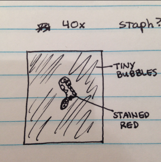Drawing of sample at 40x magnification. Best guess: staph