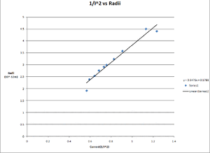 - The final equation for constant voltage can be written as [math]\displaystyle{ \frac{m}{e}\times \frac{1}{I^2}=\frac{(7.8\times10 ^{-4}\times R)^2}{2\times V} }[/math] with voltage being a constant and the radii changing and the current changing