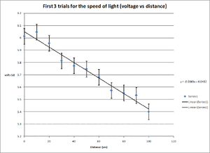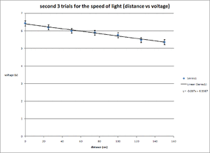 - To find the speed of light first I needed to graph the voltage vs the distance the light would travel and find a linear fit.