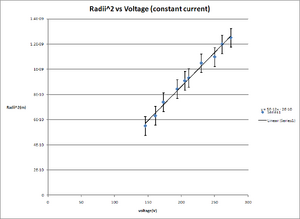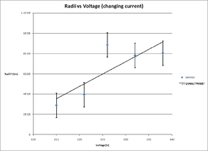 From Table 1(Fig. 4), the value of e/m while holding the current constant at 1.35 amps was 1.85+/-0.12*10^11 coul/kg. Using Microsoft Excel, a plot of our data radii62 vs voltage(Fig. 6) is compared to a liner fit of the data, and as there is no obvious systematic deviation this is a good fit for the data. From our value for e/m the error is 5.27% when compared to the value from "The Electronic Atomic Weight and e/m Ratio6" of 1.76*10^11 coul/kg.