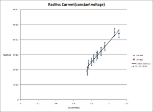 In our experiment, we held the current along the coils constant at 1.35A while fluctuating the voltage on the electron gun from a max value of 250V to a minimum voltage of 146V. We observed that the radius of the electron beam increased with the more voltage we applied while keeping the current constant. In the next set of experiments, we kept the voltage constant at 143V and changed the range of current from 0.9A to 1.33A. We observed that the radii increased as we decreased the current along the coils. We took data on the radii versus the current and radii versus the voltage and this can be found on my data page for this lab.