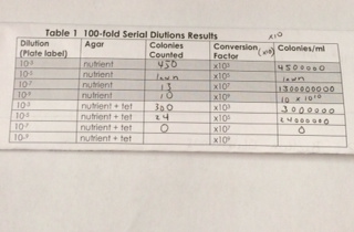 100-fold serial dilutions of the hay infusion culture were prepared and plated on 8 agar petri dishes. Four of the dishes had the antibiotic tetracycline in addition to the agar.