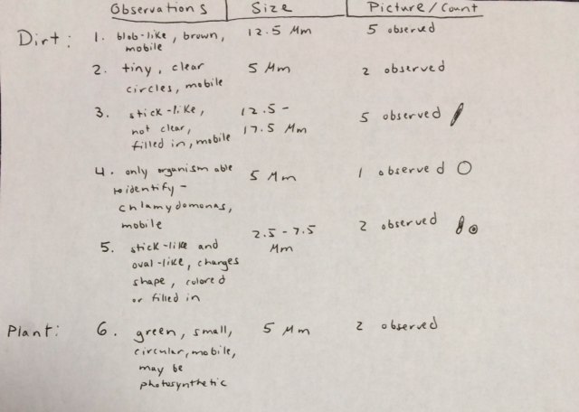 Samples were taken from the dirt matter near the bottom of the jar and plant matter near the top of the jar. The organisms near each sample will differ because plants and dirt form different niches. Slides were prepared from the dirt sample and plant sample and observed under a microscope.