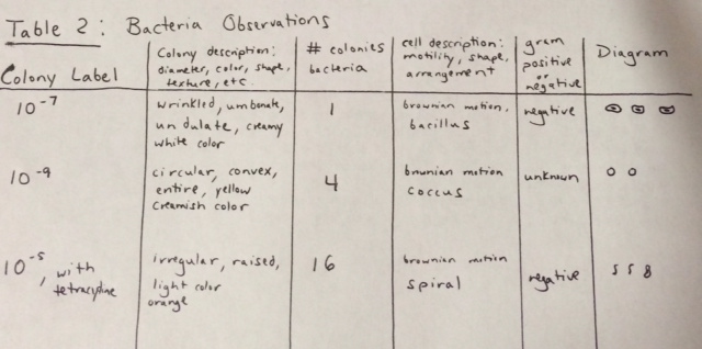 Conclusions: Different colonies of bacteria were observed from the agar plates, with the tetracycline plates having less bacterial growth on them due to antibiotic sensitivity. Bacteria from specific colonies on three plates, specified in Table 2 in Procedure 3 above, were observed under a microscope and gram-stained to determine that the plates contained gram-negative bacteria. The bacterial samples with the amplified 16S rRNA gene will be run through PCR next week to help further identify them.