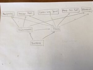 The organisms within our transect represent an ecological community. They feed off of each other and need each other to thrive. The plants feed off of nutrients in the soil left behind by decomposers, in turn invertebrates and vertebrates feed on the plants. Some vertebrates also feed on the invertebrates. When the vertebrates and invertebrates and plants die, decomposers such as fungi and bacteria help them decompose and the nutrients return to the soil for the cycle to restart.