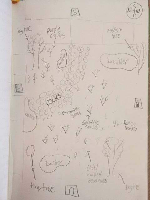 Below is both a drawing and digital picture of my group’s transect, the wildlife habitat ecosystem, or transect 2.