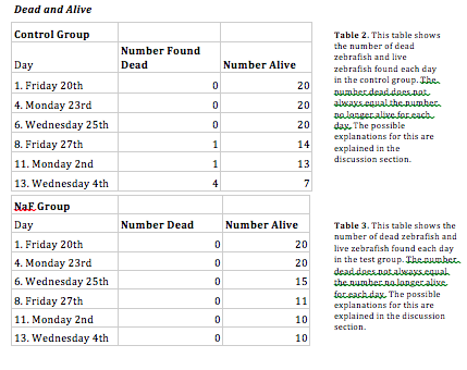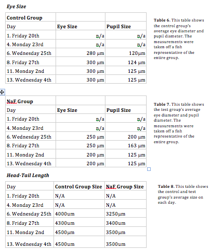 This study followed zebrafish over the course of two weeks as they developed from fertilized eggs to tadpoles. To set up the experiment, we obtained two identical petri dishes and designated one as a control dish and the second as the test dish. The control dish was filled with 20mL of filtered Deerpark water using a motorized pipette filler. The fluoride dish was filled with 20mL of a solution of .1% sodium fluoride. Two transfer pipettes were obtained, and the tips of each pipette were cut with scissors. 20 zebrafish eggs were transferred from a container to the control dish using a transfer pipette. 20 more zebrafish eggs were transferred using a second transfer pipette. The two petri dishes were then observed under a dissecting microscope to determine the life stage of the zebrafish. Despite efforts to use sterile instruments and clean water, the first batch of zebrafish became moldy after less than two days. Therefore, two days after setting up the experiment, the steps described above had to be repeated with new zebrafish eggs. Particular care was taken to choose eggs with little mold. After the experiment was successfully set up, the fish were monitored and petri dishes cleaned once every Monday, Wednesday, and Friday for two weeks. One partner came in on Mondays while the other came in on Fridays. Both partners participated in monitoring and observing the zebrafish on Wednesdays. Each day we came in, we first counted the number of zebrafish hatched, the number dead, and the number alive in both the control and test group. We observed the fish to see if there were any obvious differences in movement, size, or body shape. We also observed the fish under a dissecting microscope to note color and to find a fish representative of the group. Once a representative fish from each section was found, we used a transfer pipette to take the fish from the petri dish to a depression slide. We measured the pupil size, eye size, and body length under the 4x objective on a microscope. If possible, we attempted to take the heart rate as well. We also observed eye movement and attempted to calculate moves per minute. We chose eye and body size and movement-related measurements because previous research on the subject suggested that sodium fluoride stunted head-to-tail length and inhibited movement in developing embryos and tadpoles. After observing a fish from the control and the test group, we used a transfer pipette to bring them back to the petri dish. We cleaned the fluid in each dish, using a transfer pipette to remove any dirt, leftover food, or mold we found in the fluid and place it into a waste container. Any egg shells or dead zebrafish were also pipetted out and placed in the waste container. The dirty fluid we took out, was then replaced with 20mL of new fluid. More new fluid was added each day than taken out to make up for the effects of evaporation. Once the fish had hatched from their eggs, we also added a drop of food to each dish each day we came in. Only one drop was added to keep the leftover food from molding. After each day, we recorded our data into a Google spreadsheet. Several days into the experiment, after all the zebrafish had hatched, we selected one specimen from each group to be sacrificed for observation. We put each hatchling in a separate labeled tube. To each tube we added a tricaine solution, and the TA added paraformaldehyde. The TA then fixed the samples, which we observed in a depression slide under the microscope the next week. To end the experiment, we moved the live control fish into a large bowl with other live control fish, and we put the live test fish in a different bowl with other live test fish. We then discarded the dead fish and leftover fluid into a waste container.