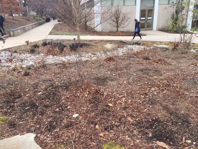 Our transect was located on the North side of campus, on a slight slope. Aside from the slight downward tilt, the transect was mostly flat, with few bumps or small hills. The soil appeared hard and dry, but was surprising moist and loose once we began collecting samples. We found that our transect contained diverse biotic elements, but relatively uniform abiotic elements. The abiotic factors we documented were a piece of crumpled tissue paper, a few large boulders on the periphery of the transect, a row of smaller rocks dividing the transect, and lots of dirt and mulch throughout. Most of the transect, in fact, was covered in brittle dirt or scattered with wood chip mulch. When we came to biotic factors, we found more diversity. For plants, there were four trees, two of them big, one medium, and one small, that created the boundaries for our transect. There were several clumps of shrubs, some in the south with numerous purple leaves and some towards the north along the rocks that were stick-like and bare of leaves. Small clumps of monkey grass grew right next to the rocks as well, and fallen leaves scattered the ground. Since we were out late at night, there were few bird species, but observing the transect during the day revealed numerous sparrows. Though not seen, our group heard and felt at least one rat scurrying in the transect. We saw no bugs in the transect, but their absence could be due to the cold winter weather.