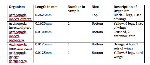 There were very few invertebrates in our petri dishes. Though we were able to find five after much searching, our transect clearly contained far fewer invertebrates than any other type of organism we have studied thus far. Every invertebrate we found was small, ranging from 0.01mm to 0.2625mm. We found two different kinds of flies, the largest organisms in the sample. The smallest organism was the psocoptera, which was a winged insect like the flies. The most common invertebrates in the wildlife habitat appear to be small winged invertebrates like flies and psocopteras. Below is a table detailing our results and some pictures of our invertebrates.