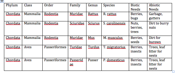 There are few vertebrates that in habit our transect. Squirrels thrive in the trees, while we have seen rats scurrying on the ground. Mice might also be likely to thrive in the wildlife habitat. Birds like sparrows and robins would also be likely to make their homes in the habitat. However, since it is winter, few vertebrates are outside. Aside from squirrels and rats, we have seen no vertebrates in our transect. Below is a table of the five possible species that inhabit our transect and a list of biotic and abiotic factors that might benefit them.