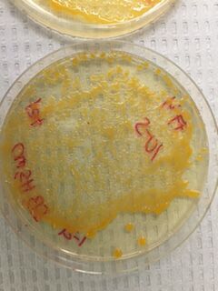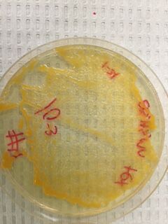 First we observed our Hay Infusions to see how they had changed over the course of the week. After taking several pictures of the infusion, we moved on to analyzing the bacteria plates. We collected our plates and observed the color and size of both the nutrient and the tetracycline (henceforth referred to as tet) plates. We counted, as best we could, the number of colonies on each plate and recorded the information. We next created two wet slides of the bacteria. We took one sample from the clear bacteria growing in the 10-9 nutrient plate and one sample from the orange bacteria growing in the 10-3 tet plate. Using a metal loop, we put the samples on a slide and observed them as best we could. Without staining, however, it was difficult to find and see the bacteria clearly. The next step, then, was to stain the bacteria. We did this by taking four chosen slides (10-3 and 10-9 in both nutrient and tet plates) and sealing the bacteria into place by passing it several times over a flame. After the bacteria was heat fixed, we put the slides over a dying bin and washing them with crystal violet die, iodine mordant, alcohol, and safranin stain. Between each stain, we washed the entire slide with water to clear the previous stain away. Once the bacteria was stained, washed, and dried, we used microscopes to exam each sample and determine whether it was gram positive or negative. If the color remained in the bacteria it was gram positive, and if there was no color, it was gram negative. Once the observation was complete, we took four samples from the agar plates again to prepare for PCR. We transferred the bacteria into 100 microliters of water, incubated it at 100°C for 10 minutes, and centrifuged it for 5 minutes. We then added water to a PCR tube to dissolve the bead and poured the supernatant from the centrifuged tubes into the PCR tube. We then placed it in the PCR machine.