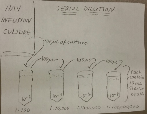 Methods The first procedure focused on learning how to accurately use the dichotomous key to identify known organisms on a wet mount under the microscope. Once comfortable with this skill, the dichotomous key was used to identify unknown organisms under the 4X and 10X objectives. The second procedure involved making wet mounts of samples from the hay infusion culture obtained the week previous. After noting all observations of these samples, the dichotomous key was again used to identify as many present organisms as possible. The third procedure required prepping and plating serial dilutions of samples from the hay infusion culture, once it had been swirled (allowing the settled niches of the organisms to blend). 100 mL tubes of sterile broth were labeled and 100 microliters of the hay infusion culture was micropippeted into the first tube and shaken. 100 microliters was transferred from tube 1 to tube 2 in similar fashion until all four tubes are ready (see diagram below for reference).