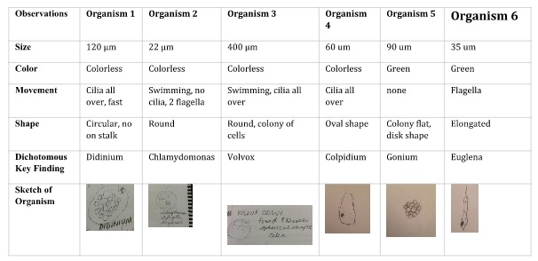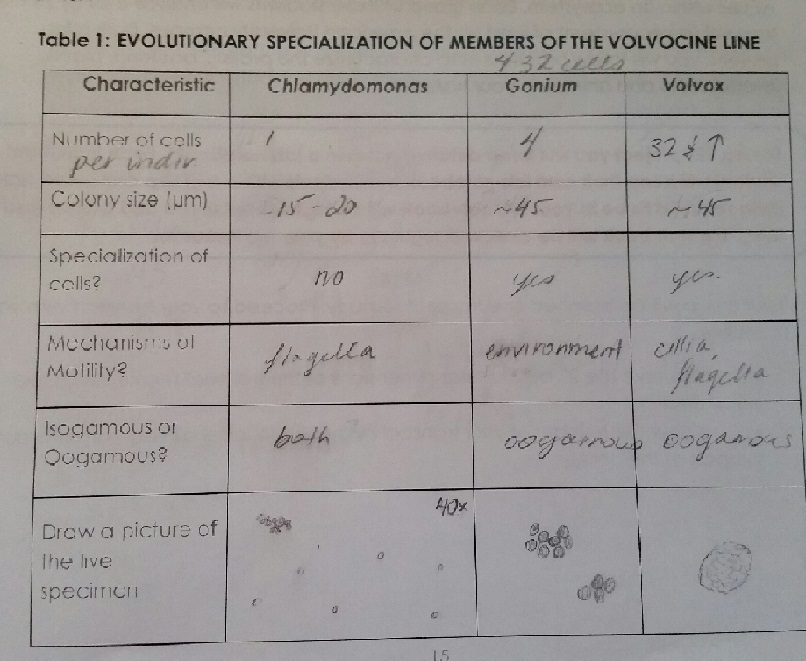Methods In the first half of the experiment living slides of Chlamydomonas, Gonium, and Volvox were examined and observations were recorded in the table below. The mechanisms for motility, ways of reproduction, and colony size were all noted. The second part of the experiment consisted of visiting the assigned Transect on campus to develop our observational skills. A sample was collected in a 50 mL conical tube for a hay infusion culture to be made subsequently, and everything that went into this sample was recorded for later use. Once back to the lab, the culture was made by placing 10 grams of the sample into a large plastic jar along with 500 mLs of deerpark water. 1 gram of dried milk was added to provide food to any living organisms in the sample that may need it. The culture was gently mixed and the jar was left open in the lab for a week, after being labeled “Transect 1”.