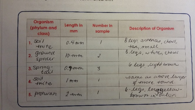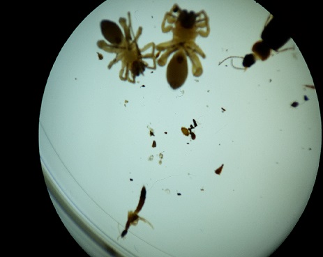 With the funnel attached securely and sealed to the tube below containing the ethanol solution, the seal was carefully removed and the leaf litter was discarded from the funnel. The sample collected in the tube below was split into two observable dishes. One contained ~10-15 mL of sample from the top of the tube, and another from the bottom, as organism of different sizes separated out into layers within the solution. Five different invertebrates were selected from the samples for analysis and measured using the microscopes ocular micrometer. All observations were collected in the table below. A large amount of ground spiders were found in the sample, along with springtails (primitive insects).