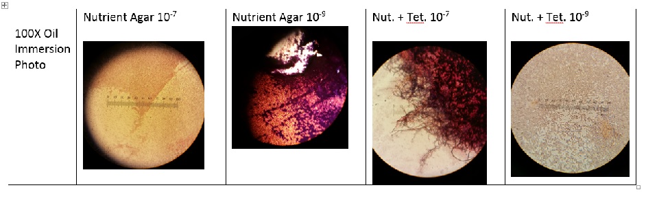 When observing the bacterial cell morphology, the use of 100X oil immersion was first familiarized before any observations were made. Four wet mounts were prepared for observation, 2 from the nutrient agar plates, and 2 from the nutrient agar plates with tetracycline (10-7 and 10-9 of each). Under 100X oil immersion, the nutrient agar 10-7 colony displayed hues of orange and blue, clumped into colonies about 20 µm in diameter, and seemingly immobile. Those on the nutrient agar 10-9 plate were dark purple in color, long/ string-like, and also seemingly immobile. When observing the antibiotic agar plates, the 10-7 colony was approximately 25 µm in diameter and appeared semi-transparent, similar to a clump of hair in appearance, while the 10-9 tet-plate did not fully focus, the colony showed long, string-like strips that formed clusters.