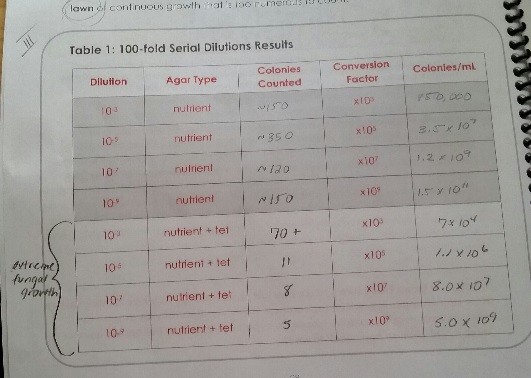 This lab involved observing the growth of the nutrient and tetracycline agar plates that were inoculated from the infusion cultures. The numbers of each colony were carefully counted and recorded in the table below. One observation made was that all tetracycline plates harbored a large amount of fungal growth but less bacterial growth, indicating the presence of antibiotic-resistant bacteria present in the culture. Approximately 3-4 species of bacteria seemed to be unaffected by the antibiotics, while the rest that flourished on the non-tet plates. When the tetracycline targets the peptidoglycan of the bacteria’s cell walls, the bacteria not carrying the resistant-mutation do not survive to reproduce.