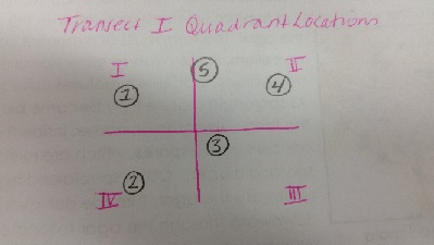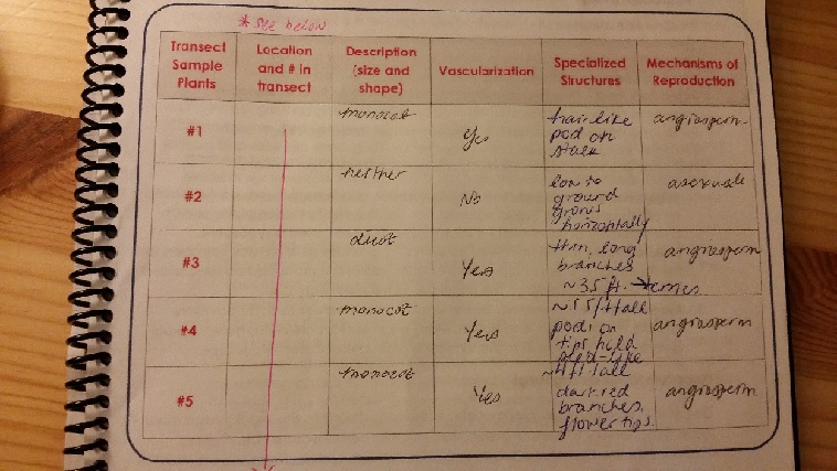 The purpose of this lab was to understand the diverse characteristics of plants as well as explore the importance of fungi and its functions. In the first procedure, two Ziploc bags were taken to Transect 1: one for a large 500 gram collection of leaf litter and one for obtaining 5 different plant species present. The leaves were later placed in a Berlese funnel for the later collection of invertebrates. Each plant was marked with a number, 1 -5, and their locations were marked on a representative four quadrant grid below.