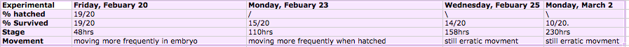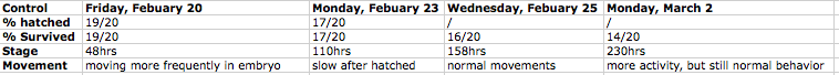 The next portion of the lab involved preparing for the Zebrafish experiment. Starting with ~18 hour hold fertilized eggs, 20 healthy, translucent embryos were placed into a control dish and another 20 were placed into an experimental dish. With the independent variable in this case being nicotine, 20 mL of water was placed in each dish and the 4 mL of 25mg/mL was placed into only one dish. This administered a dosage of 100 mg of nicotine to the developing embryos. Besides this variable, all others were kept constant between the two dishes – temperature at ~28 degrees C, pH around 7-7.5, and normal day and night light exposure. With this experiment set up, it was hypothesized that the zebrafish exposed to nicotine would display a higher level of movement/ activity pre- and post hatch. To measure movement of the embryos after the administration of the drug, each dish was examined in 10 second intervals, counting and recording the number of movements. This process was repeated 2 days later and then again 5 days later – each time having the nicotine readministered in 100 mg doses. The subsequent days also involved removing 10 mL of the dirty water containing egg shells and dead embryos and adding 25 mLs of clean water. On day 7, a drop of Paramecium was added to each dish as a source of food. The observations made on day 5 were recorded in table 2.