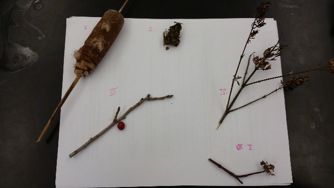 Plant number one has tall long, narrow leaf shoots, with thick soft casings along the top, which are brown around the outside and white in the middle– commonly referred to as cattails. These soft fluffy pieces that can be pulled from this casing are very light weight can easily be carried by the wind – likely the method of pollination for the plant. From the wetland environment of transect 1, this plant likely falls in the Typha genus. Plant two was along the ground, under coverage of other plants, mossy and dark green, and very integrated into the soil. This plant shows only horizontal growth, but no vertical growth – likely a bryophyte. Plant three, standing about 3.5 ft tall consists of long thin branches which are alive and green on the inside with a brown dusty coating on the outside. Small red berries were also found on this plant (which was kindly labeled for us as a “red cardinal flower bush” – a member of the lobelia genus). Plant four was taller and also bush-like, standing at about 5.5 ft tall. Consisting of very thin, long branches, the plant carries small, dried, brown pod-like structures which when cracked open reveal a seed-like feature. Plant five stood around 4 ft tall with long, thin, dark-red branches that have small flower-like structures on the tips. Both plants 4 and 5 may be considered angiosperms.
