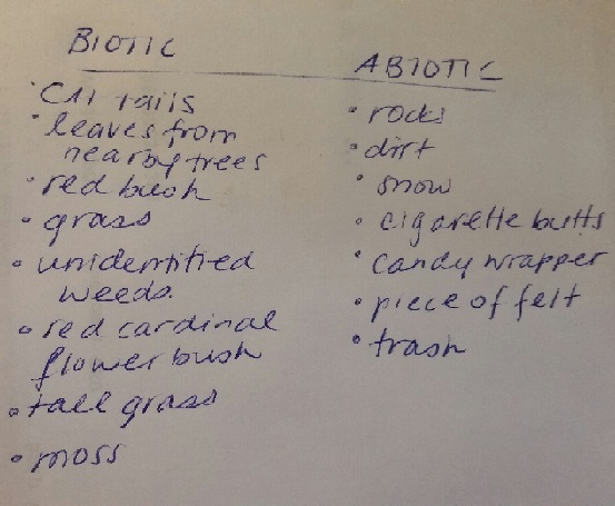 Transect 1 considered to be the “Marsh” was full of life, even during the cold season. It is located close to Massachusetts Avenue, containing a drain, where any run-off can go. The ground was relatively soft and wet, due to recent snow-fall, but not yet fully frozen. Both biotic and abiotic components found within the transect were recorded in the table below. A photo of transect 1 has also been provided below. It is likely that once the culture incubates for a week, there will be a wide range of organisms to be found from Transect 1.