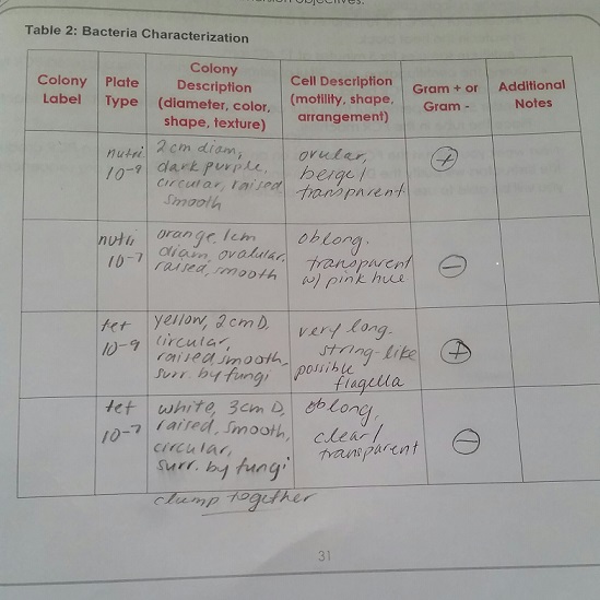 Gram Stain Materials and Methods – When beginning this process, a sample of growth was collected from the each agar plate after sterilizing the loop over a Bunsen burner. The slides were labeled 10-7, 10-9, Tet 10-7 , and Tet 10-9. The slides were taken to the staining trays and the smears were covered with crystal violet for a minute, and then rinsed with water. The smear was the covered with iodine mordant for another minute and rinsed with water. To remove the color, the smear was flooded with 95% alcohol for 10-20 seconds, and then rinsed again. The smear is the covered again but this time with safranin for 25 seconds, rinsed with water, and blotted with a kimwipe. Each sample is observed under 40X and 100X oil immersion and all data was recorded in the table below – pictures were taken of each sample instead of drawing to preserve accuracy.