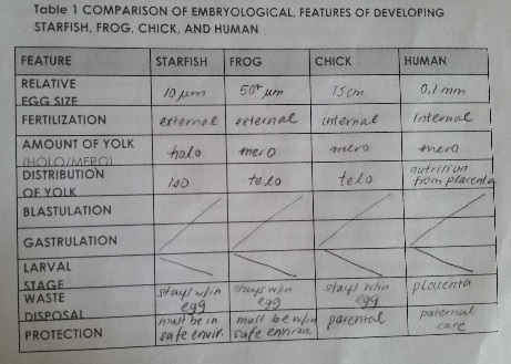The first three procedures of the lab consisted of comparing the embryonic development of starfish (Asterias), Frogs, and Chicks. With information about the cleavage and gastrulation stages provides for each organism, observations were made and recorded in table 1. These observations, along with the new knowledge of these developmental stages, were compared to human embryonic development.