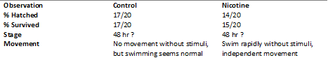 The zebrafish were also tended to during this lab. In the control group 17/20 had survived and as before, did not swim without stimuli - while 16/20 of the Nicotine group survived and were swimming around without any sort of stimuli. There were two eggs which had not hatched on day 5 in the nicotine group but did by day 7. This may indicate nicotine's involvement in delayed development.