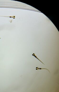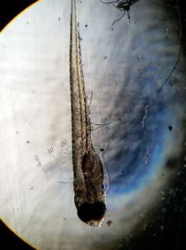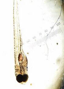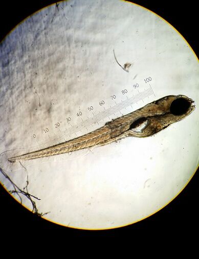 This most recent consisted of peer-reviewing the introductions of the zebrafish experiments. Due to the shared lab space, both the nicotine and control sample of the fish were missing - most likely spilled on the floor (and left for dead) - a very sad say indeed. However, deceased members of both groups were preserved in the previous lab, and these specimens were placed into depressions slides and analyzed under 10X magnification. It was determined from the use of the ocular micrometer that the nicotine exposed fish displayed slightly smaller eye diameter and total length than those in the control group. Although this difference only varied by a matter of 5-10 micrometers, it may indicate nicotine's slowing effects of the development of the embryos. It is also taken into account that these fish may have died 24 hours apart, and therefore may differ in size due to growth period being cut short for some and not others.
