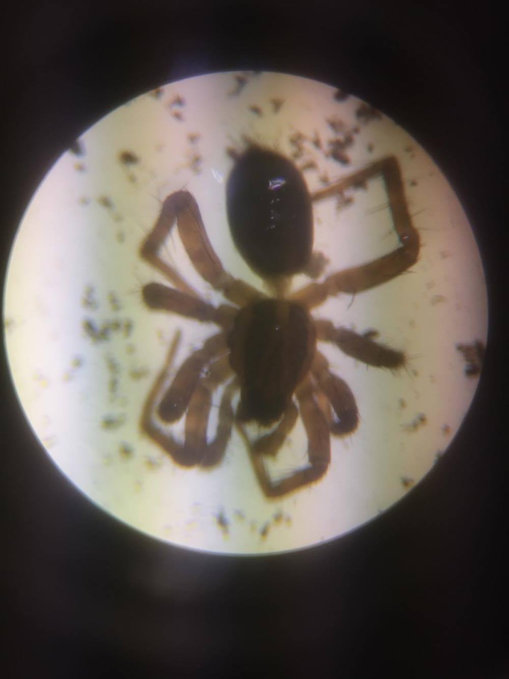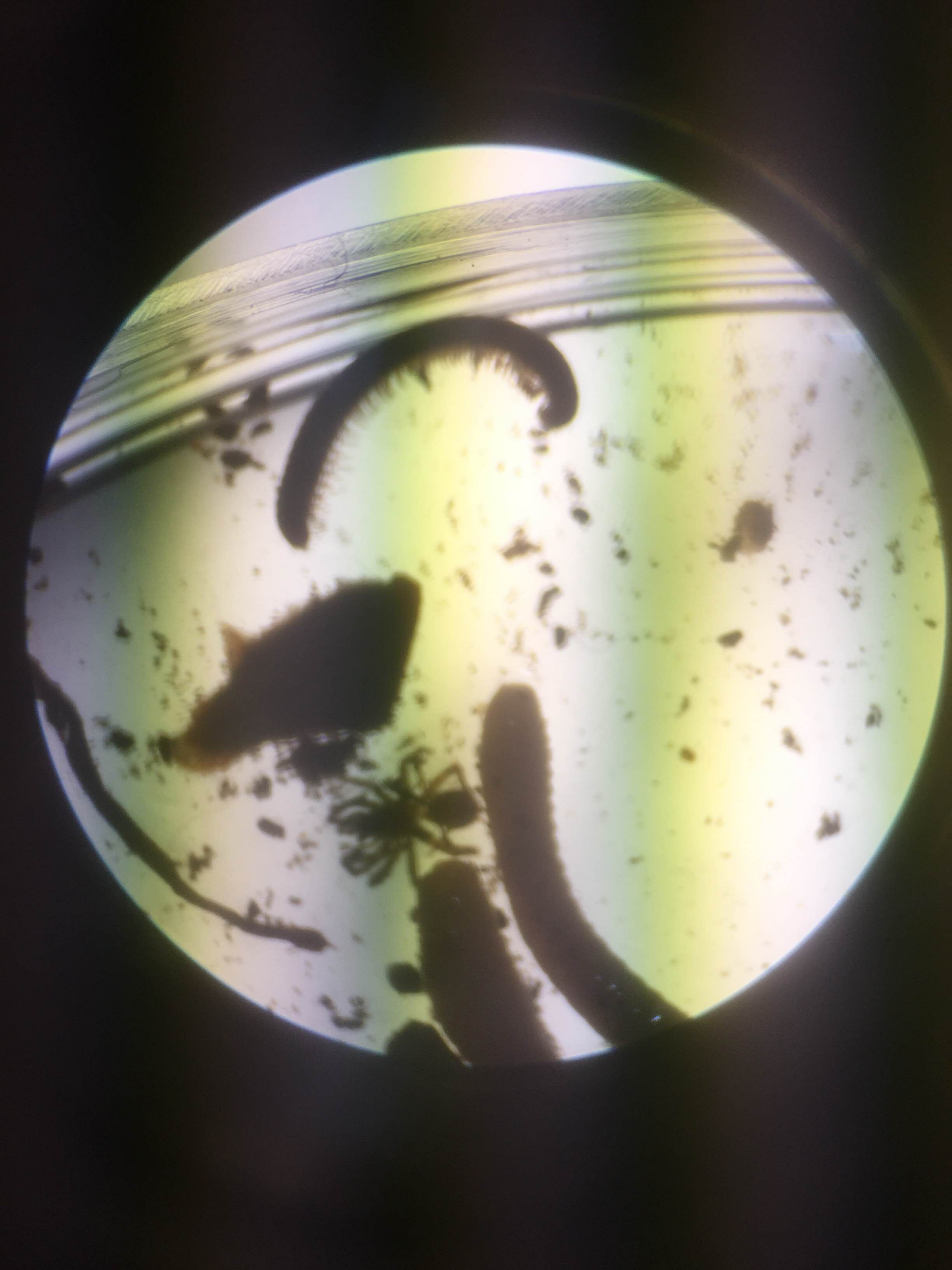 Materials and Methods: We broke down the Berlese funnel and drained the ethanol and organisms into 3 separate petri dishes. We observed a large number of many different organisms, and used a pencil to move the organisms around under the microscope to view them from different angles.