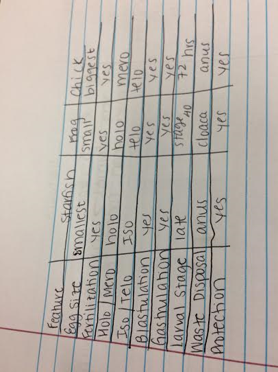 Embryology and Development 2/16/16 Purpose: In this lab, we observed the embryology of frogs, starfish and chickens. We identified features such as blastulation, gastrulation, and cleavage. We then presented and prepared our Zebrafish experiments. Our experiment's purpose is to test the effects of nicotine on the development of zebrafish embryos.