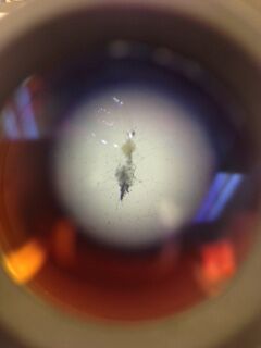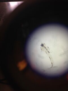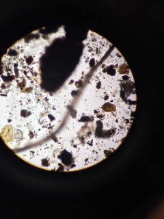 The second sample taken came from the soil at the bottom of the culture. Here, a peranema, arcella, and paramecium bursaria were identified. The peranema and paramecium were both more motile than the arcella, which was creeping slowly around the sample. While the peranema and arcella were colorless and therefore could be presumed to be protists, the paramecium itself was green in color, meaning it is photosynthetic. This makes sense, as it was found close to the clump of dirt in which plants may have been growing. The arcella was 63 um, the paramecium was 156 um, and the paranema was 45 um. Pictured below is the sample of soil where the peranema was seen: