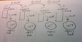 Procedure III - Preparing & Plating Serial Dilutions: Upon completing the Hay Infusion, a serial dilution was to be plated, which would allow prokaryotic organisms and possibly fungi from the culture to be observed. To do this, 4 tubes of 10 mL sterile broth were labeled with 10^-2, 10^-4, 10^-6, and 10^-8. Four nutrient agar plates and four nutrient agar plus tetracycline plates were then obtained. One plate from each of the groups was labeled with 10^-3, 10^-5, 10^-7, and 10^-9, with the tetracycline plates labels prefaced with "tet." Then, using a micropipettor, 100 microliters of the culture was added to the broth in the 10^-2 tube. The tube was then mixed thoroughly. One hundred microliters of broth from the 10^-2 tube was added to the 10^-4 tube, and swirled well. This was repeated to make the 10^-6 and 10^-8 dilutions. To plate these dilutions on the agar plates, 100 microliters from the 10^-2 tube was pipetted onto the plate labeled 10^-3. The sample was carefully spread on the plate, and the procedure was repeated on the 10^-3 plate containing tetracycline. This process was repeated to add the 10^-4 dilution to the 10^-5 plate, the 10^-6 dilution to the 10^-7 plate, and the 10^-8 dilution to the 10^-9 plate. The plates were placed on a rack to incubate at room temperature for one week. The process is depicted below.