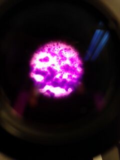 The yellow 10^-3 colony after staining. There are not many bacteria present in this view; however, because they are violet, it is known that peptidoglycan is present in their cell walls.