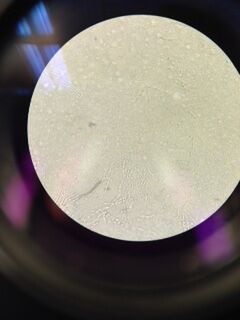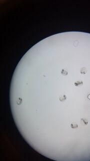 A white colony from the 10^-3 plate was sampled and observed under a microscope without any staining at 40x. They are very small and difficult to see.