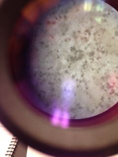 | White | 10^-3 | Approximately. .5 cm across, small, white. Entire & undulated edge. Flat elevation. Glistening, smooth surface. Circular. | Cells are vibrating, circular, and very close together. About 5 micrometers at 40x. | + |