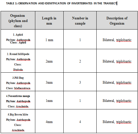 Invertebrates are very diverse and is ipmportant in observing a transect. Invetebrates have 14 different phyla. Of the 14, the invertebrates usually found in soil are arthropods. The arthropods are important because they help to break down and decompose waste and they feed on decaying plant material and take fluids from roots (Bentley, 2015).