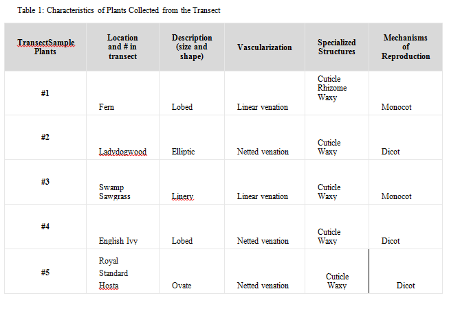 Various plants were taken from the transect and observed. The five plants were identified as fern., ladydogwood, Swamp sawgrass, english ivy and royal standard hosta. Because these plants were near the stream all had vascularization. The plants have different specialized structures because the transect is diverse.