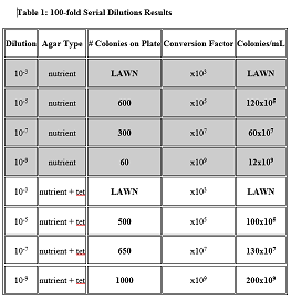 Tetracycline is an antibiotic that is used against microorganisms such as chlamydiae, mycoplasmas, rickettsiae and protozoan parasites. It also exhibits against gram-positive and gram-negative bacteria. Tetracycline blocks part of the stage of protein synthesis by inhibiting aminoacyl-tRNA from attaching to ribosomal site (Chopra). Therefore the prediction is that the plate with 10^-9 nutrient+tetracycline should have the least number of bacteria.
