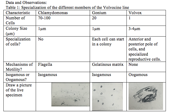 Part 1: The Volvocine Line Chlamydomonas (a motile living culture) is obtained. A wet mount slide is prepared, this means pipetting a single drop onto a slide and covering it with a coverslip, it is then observed under a microscope. If the particles are moving too fast protoslo, is added at the side of the coverslip. After the microscope is adjusted the characteristics such as number of cells, colony size (in μm), specialization of cells, mechanisms of motility, whether or not the sample is isogamous or oogamous, and a picture of the specimen are recorded. These steps are then repeated for the live cultures of gonium, and volvox.