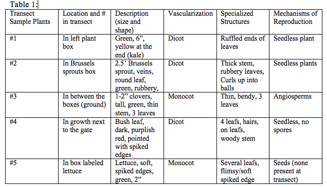In this experiment several types of plant and soil matter were collected and observed from the transect (AU Community garden). Each plant sample was identified as either dicot or monocot using the appearance. We observed whether each item had a network of veins, or flowers. A description was provided of the appearance, mechanism of reproduction, and specialization was provided for each sample of plant. The hypothesis of this lab is accepted however no seeds were found, however it is important to observe that monocot sample #5, reproduces by seeds but no seeds were found. The other monocot #3 was an angiosperm (produces flowers) rather than a plant without seeds or flowers. If this experiment were to be redone, the transects should be more carefully observed, and pictures should be taken of each plant that the samples were drawn from, in order to better identify the specialized structures and mechanisms of reproduction.