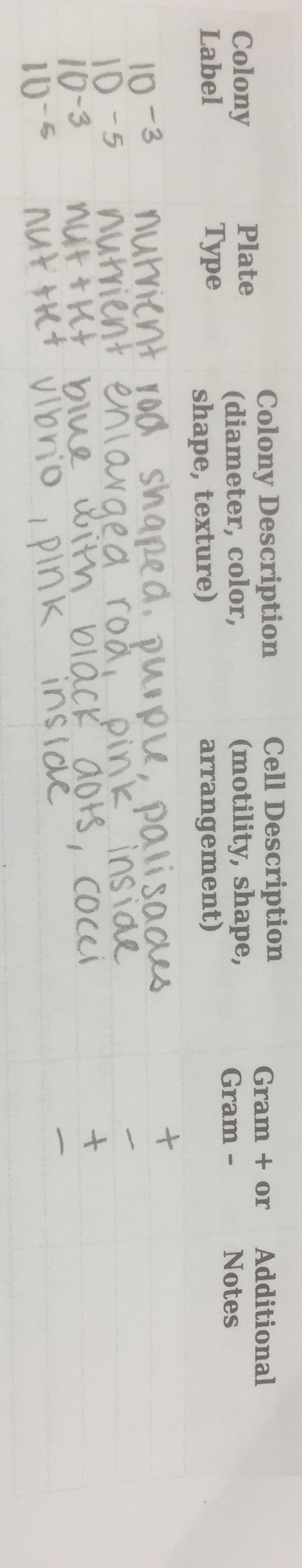 Part 3: Bacteria Cell Morphology Observe a wet mount and gram stain preparation of the bacteria grown in the plates. For the wet mount, sterilize a loop over a flame, and then scrape a small amount of grown from the surface of agar. Place a drop of water on a slide and mix the bacteria from the loop onto the slide, then place a coverslip over it. And observe the wet mount using 10X and then the 40X objective, it will be difficult to see the organisms, then determine the organism shapes and if the organisms are motile. With the gram stain process sterilize the loop over a flame and scrape a small amount of bacteria from plate. Mix it in a drop of water on a slide. Circle the area underneath with a sharpie or wax pencil. Label the slide. Heat the slide by passing it through the flame three times with the smear side up. While working on a staining tray, cover the smear with crystal violet for 1 minute. Then rinse the stain with water. Cover the smear with Gram’s iodine mordant for 1 minute, and then rinse off with water wash bottle. Decolorize the smear by flooding the bacterial smear with 95% alcohol for 10-20 seconds. Rinse it gently. It is finished decolorizing once the solvent flows colorlessly off the slide. Cover the smear with safranin stain for 20-30 seconds, and then rinse it off using a wash bottle of water. Dry the excess water by carefully blotting with a kimwipe and allow it to air dry. Focus the gram-stained sample on a low magnification, then under 40X and 100X oil immersion objectives. Record the results in Table 2. Repeat the gram stain and wet mount process for four of the colonies present.