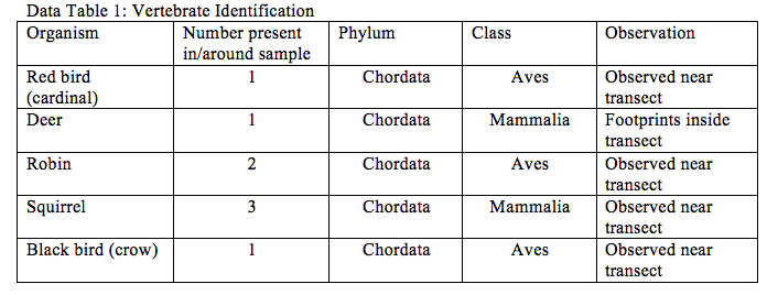 Purpose: The purpose of this experiment is to identify the different vertebrates that are present within the niche of the explored transect. The identification of different vertebrates will allow for the better understanding of what is taking place within the transect. The identification of the different vertebrates will also allow for an understanding of whether the transect is a single niche specifically for those organisms, or if the transect is a part of their niche.