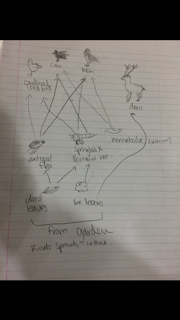This demonstrates how the organisms work together in order to sustain the community. The birds are on the same topographic level, meaning the same feeding level, while leaves shared the same level, and the arthropods share the same level. The carrying capacity of this system, may be greater, however we observed the eight items within the food web. Carrying capacity is the maximum number of individuals that can exist within an area, without depleting the resources of the area (McConnel & Abel, 2013).
