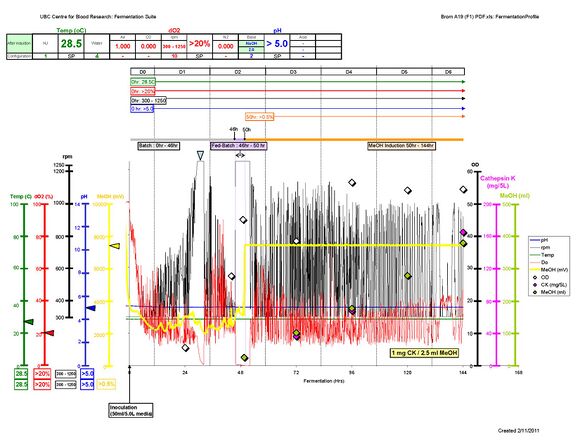 Follow up:Recently, Project BROM-A19, produced a record-breaking amount of human Cathepsin K! We procuded roughly 160 mg from 5-L Defined media. The protocol was same but with slight modification of base and it seems that timing of Fed-Batch plaied a quite important role. *Sung-Hye Grieco 17:16, 15 February 2011 (EST):