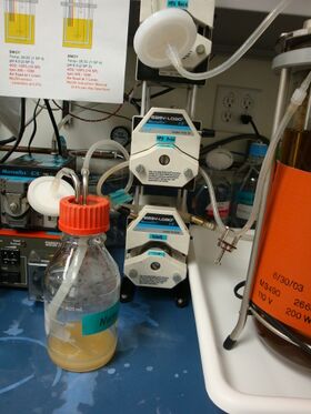 Discussion 2: Media-relatedQuestion: Why we use MD media in the begining and then change to BMGY? *Sung-Hye Grieco 12:53, 11 August 2010 (EDT): Apparently minimal media selects for double auxotrophs ? Maybe rich media loosens the selection criteria and allows one of the picZ insertions on the diploid chromosome to be dumped ? so by selecting on MD you are pickingdouble transformants in which chromosomal integration has taken place on both genomes ? Just a thought ... (Raj)*Sung-Hye Grieco 13:54, 17 August 2010 (EDT): Discussion 3: Media-related Question: Why would Fermenter #3 (the Defined Medium) have more optimal growth than Fermenter #2